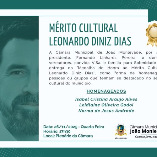 A Câmara Municipal de João Monlevade, por seu presidente, vereador Fernando Linhares, e demais vereadores, convida Vossa Senhoria e família para Solenidade de entrega da “Medalha de Honra ao Mérito Cultural Leonardo Diniz...