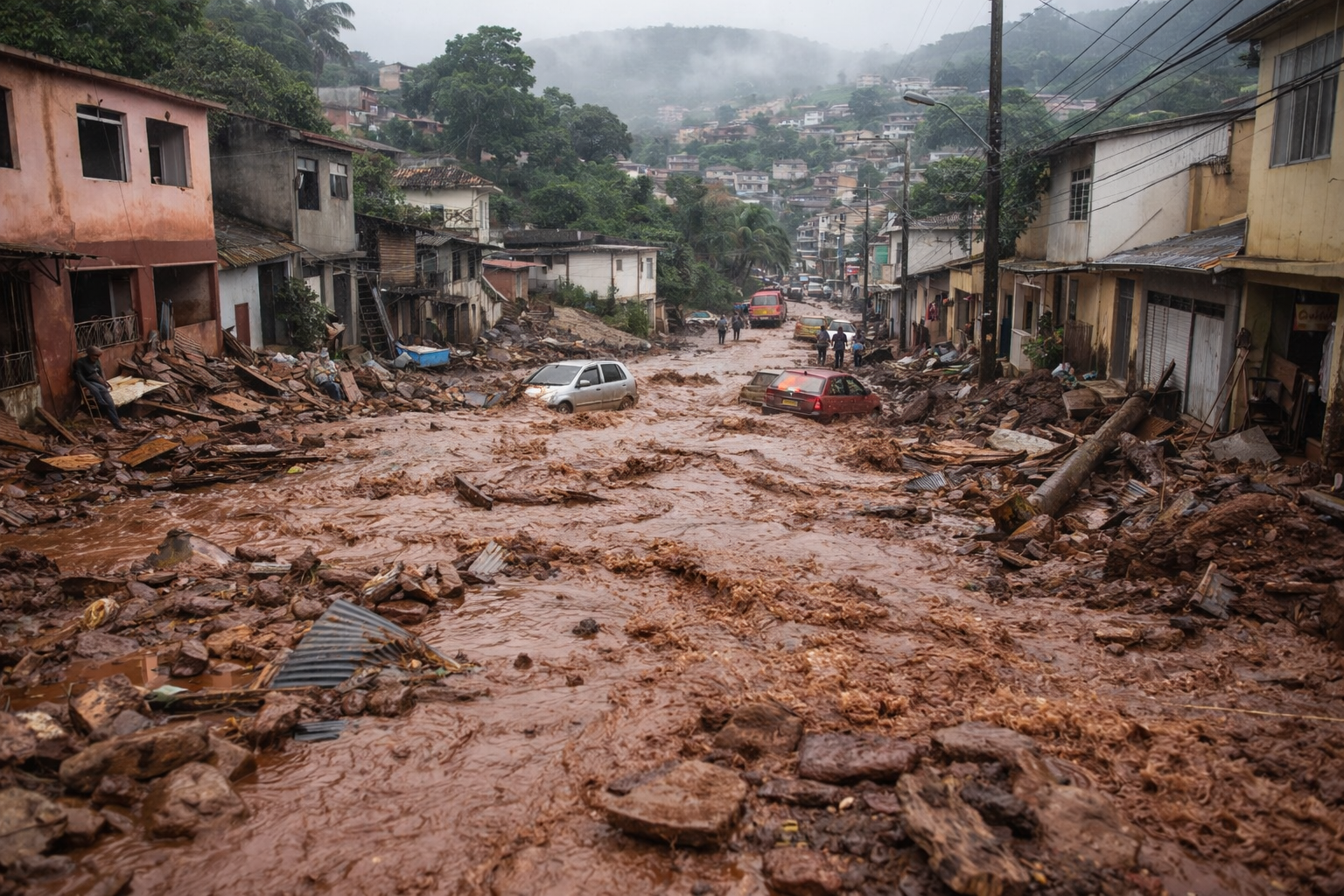 Imagens enviadas por moradores mostram carros sendo arrastados, pontos de desabamento de encostas e equipes de emergência atuando em meio à forte correnteza.