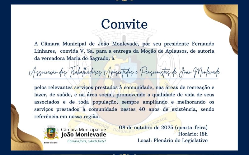 Câmara Municipal de João Monlevade, por seu presidente Fernando Linhares, convida para a entrega...