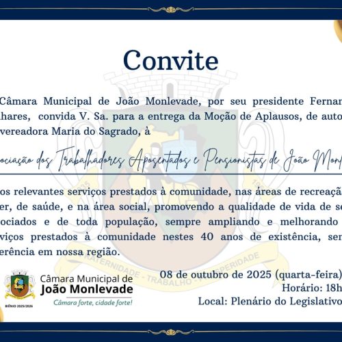 Câmara Municipal de João Monlevade, por seu presidente Fernando Linhares, convida para a entrega do título de “Moção de Aplausos”, de autoria da vereadora Maria do Sagrado, V.Sa. e família à Associação dos...
